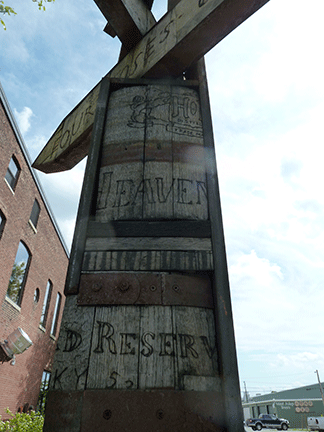 These signs made from bourbon barrels are in the parking lot where a bourbon tour embarks.